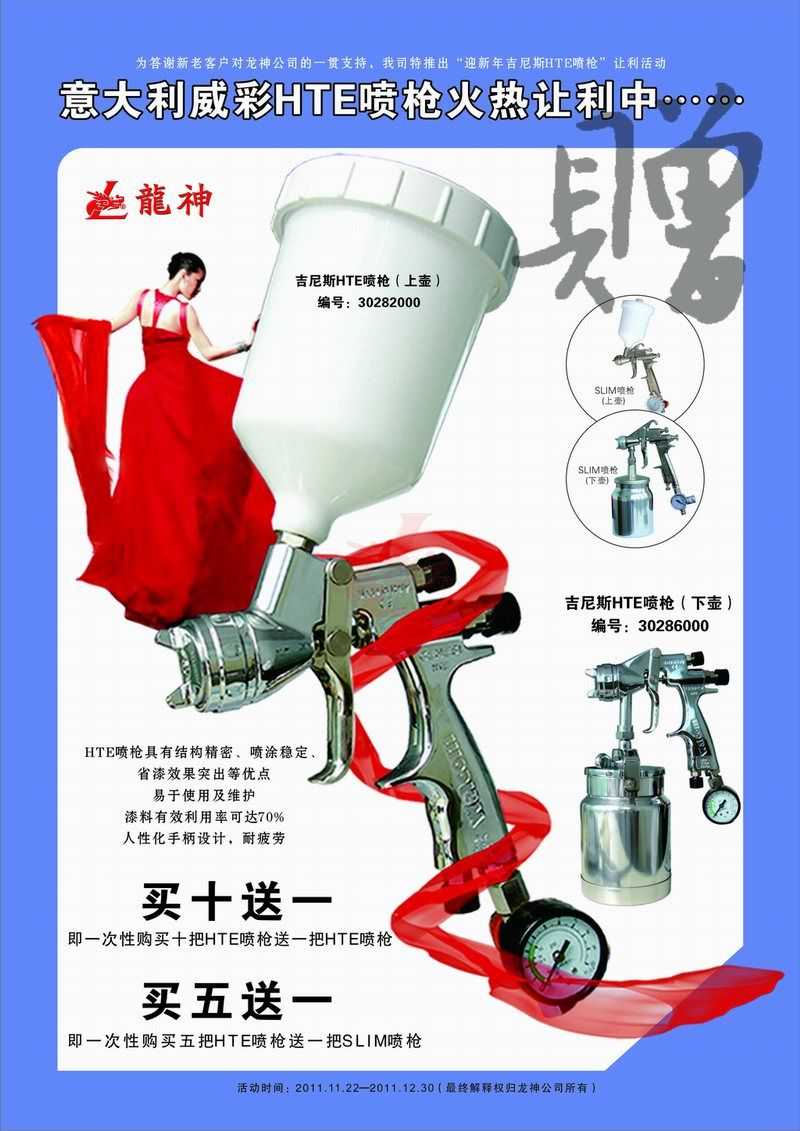 吉尼斯HTE噴槍11月促銷 吉尼斯HTE噴槍2011年11月促銷 (活動已結(jié)束,感謝您的關(guān)注) 一、主題: 吉尼斯HTE噴槍讓利促銷 二、活動目的: 讓利回饋給力促銷 三、活動時(shí)間: 1、 時(shí)間:2011年11月21日至2011年12月30日 2、 時(shí)長:共計(jì)40天 四、活動內(nèi)容: 1、 買十送一(即一次購買十把HTE噴槍送一把HTE噴槍) 2、 買五送一(即一次購買五把HTE噴槍送一把SLIM噴槍) 市場部 2011年11月17日 宣傳海報(bào) 2011-11-19 12916