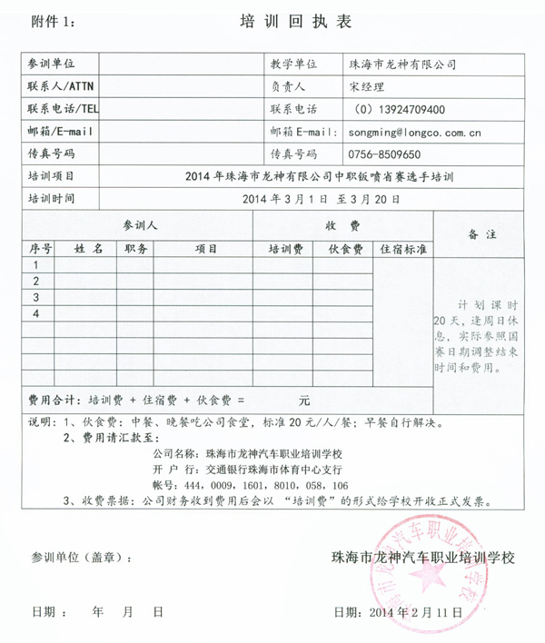 為了響應(yīng)國家“企業(yè)應(yīng)該積極融入和參與職業(yè)教育事業(yè)”的號(hào)召,讓部分參賽條件和設(shè)施不足的學(xué)校也能參加技能大賽,促進(jìn)全國中職技能大賽在全國的快速和均衡地發(fā)展,珠海市龍神有限公司憑借自身20多年的汽車鈑噴行業(yè)經(jīng)驗(yàn)和設(shè)備技術(shù)優(yōu)勢(shì),定于2014年3月1日至3月20日在珠海舉辦為期20天的汽車車身修復(fù)與涂裝技能大賽選手培訓(xùn),具體方案如下: