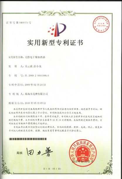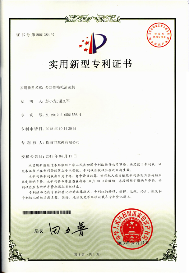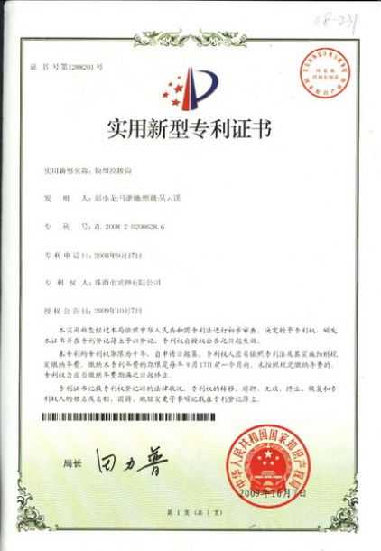 ![]() 噴槍清洗機(jī)專利證書 | ![]() 無靜電干燥加熱器專利證書 |