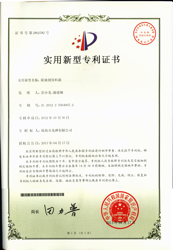 ![]() 壓縮空氣空壓機(jī)房供應(yīng)系統(tǒng)專利證書 | 除油劑導(dǎo)料器專利證書 |